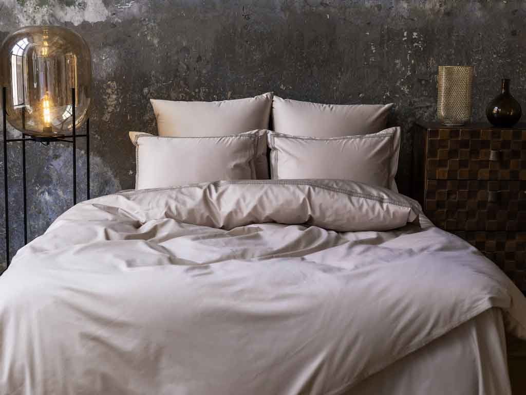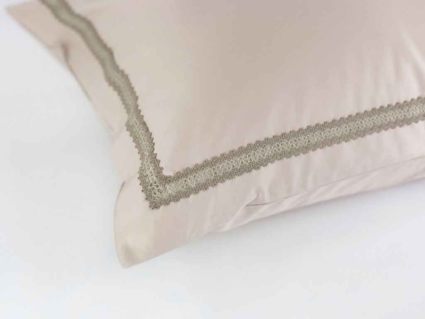 Наволочки "оксфордские", отделанные ШИРОКИМ КРУЖЕВОМ (на запахе), пододеяльник на потайной молнии, отделанный ШИРОКИМ КРУЖЕВОМ. Цвет основной ткани: бежевый; цвет кружева: бежевый.