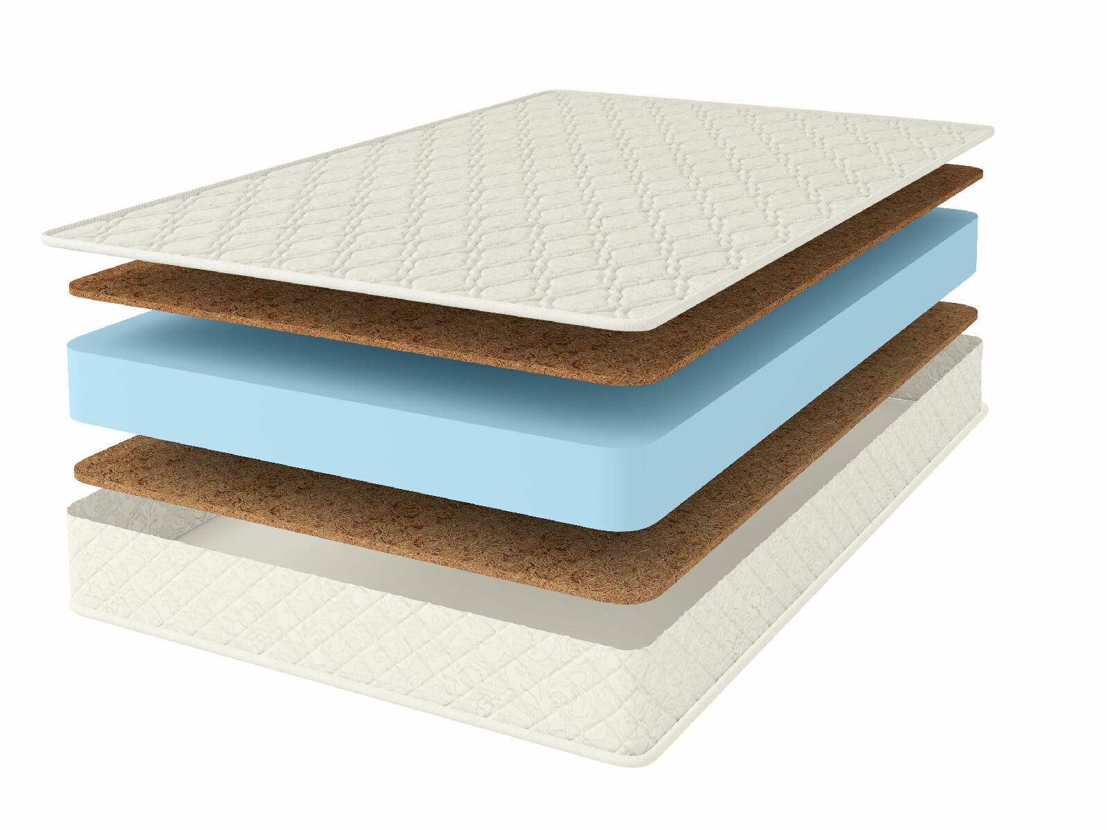 За жёсткую базу в матрасе выступает кокосовая койра. Она проложена сразу у поверхностей матраса и представляет собой достаточно тонкие и твёрдые плиты. Основой для койры служит кокосовое волокно, которое скрепляют латексным составом. В результате получается натуральный наполнитель, который обладает яркими ортопедическими качествами. Это позволяет матрасу поддерживать спину человека в анатомически правильном положении.