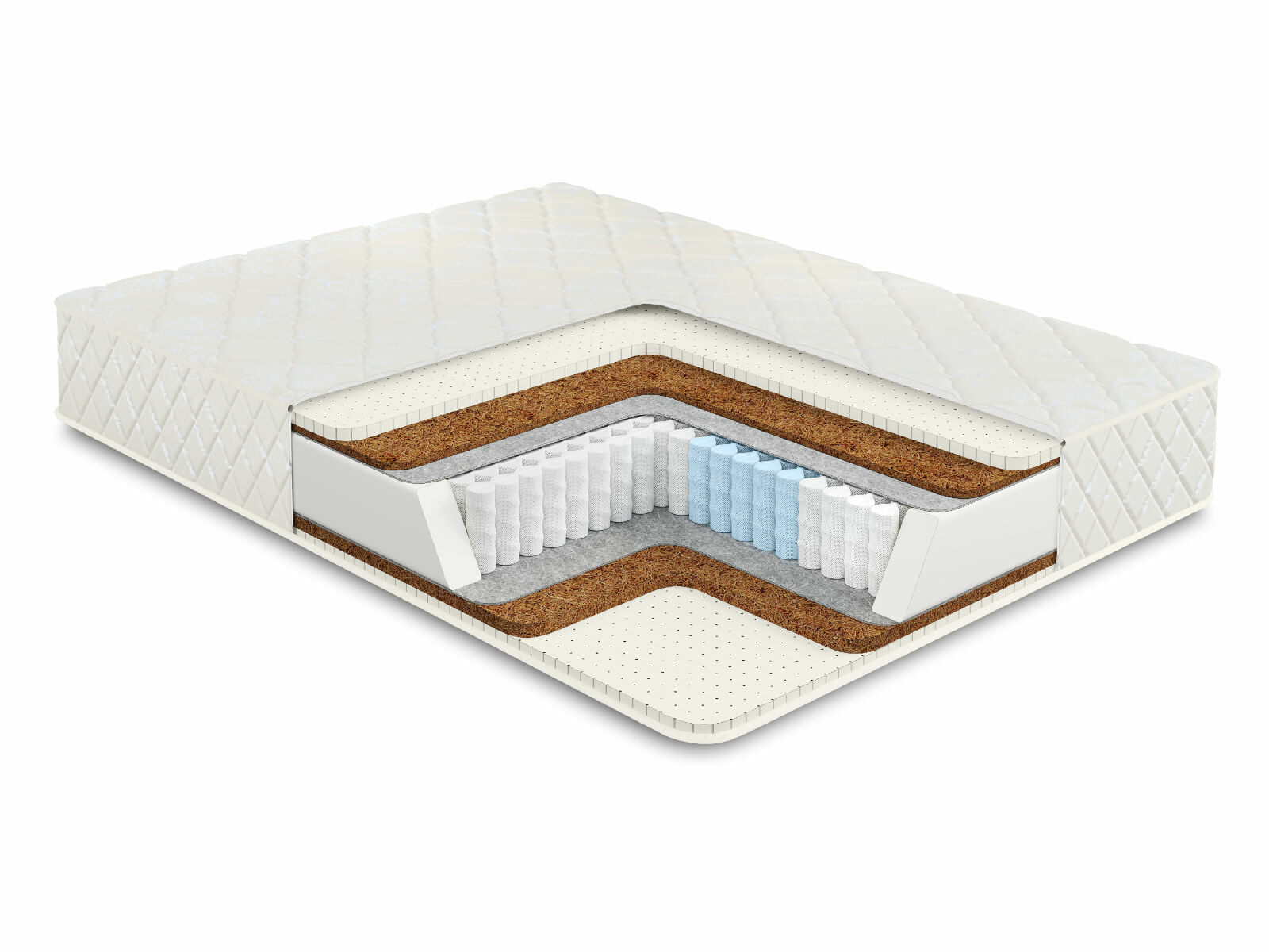 Комбинация различающихся по толщине натурального латекса и кокосовой койры с каждой из сторон придаёт матрасу дифференцируемую жёсткость. Чем больше латекса – тем мягче и адаптивнее поверхность, и напротив – чем больше кокоса, тем твёрже и плотнее матрас. Благодаря природному происхождению кокос и латекс не боятся воздействию микроорганизмов и при этом хорошо пропускают воздух. Такой матрас будет проветриваться не только снаружи, но и изнутри.
