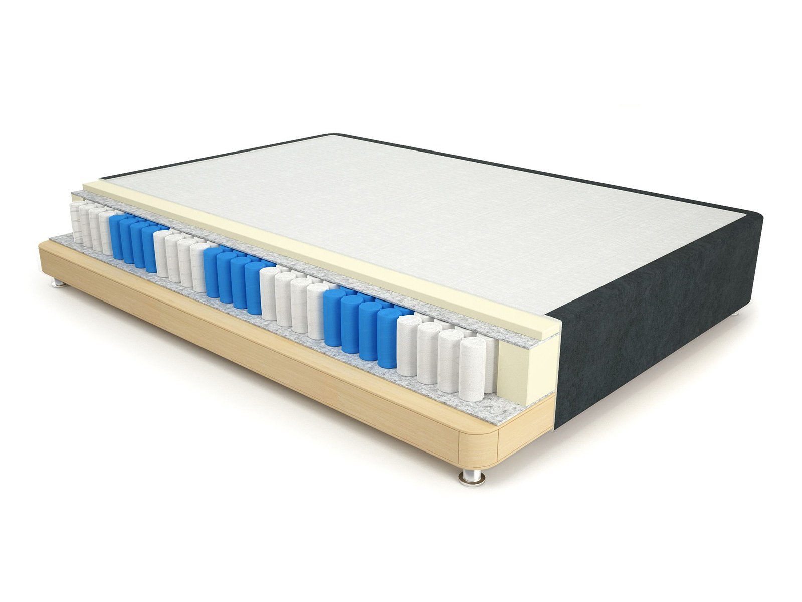 Очень стильный кроватный бокс спринг, который подойдет для тех, кому важен ортопедический эффект не только в матрасах. В основании box spring встроены пружины, что усиливает анатомический эффект матраса. Высота пружин 14 сантиметров, которые покрываются сверху двумя сантиметрами пенополиуретана.