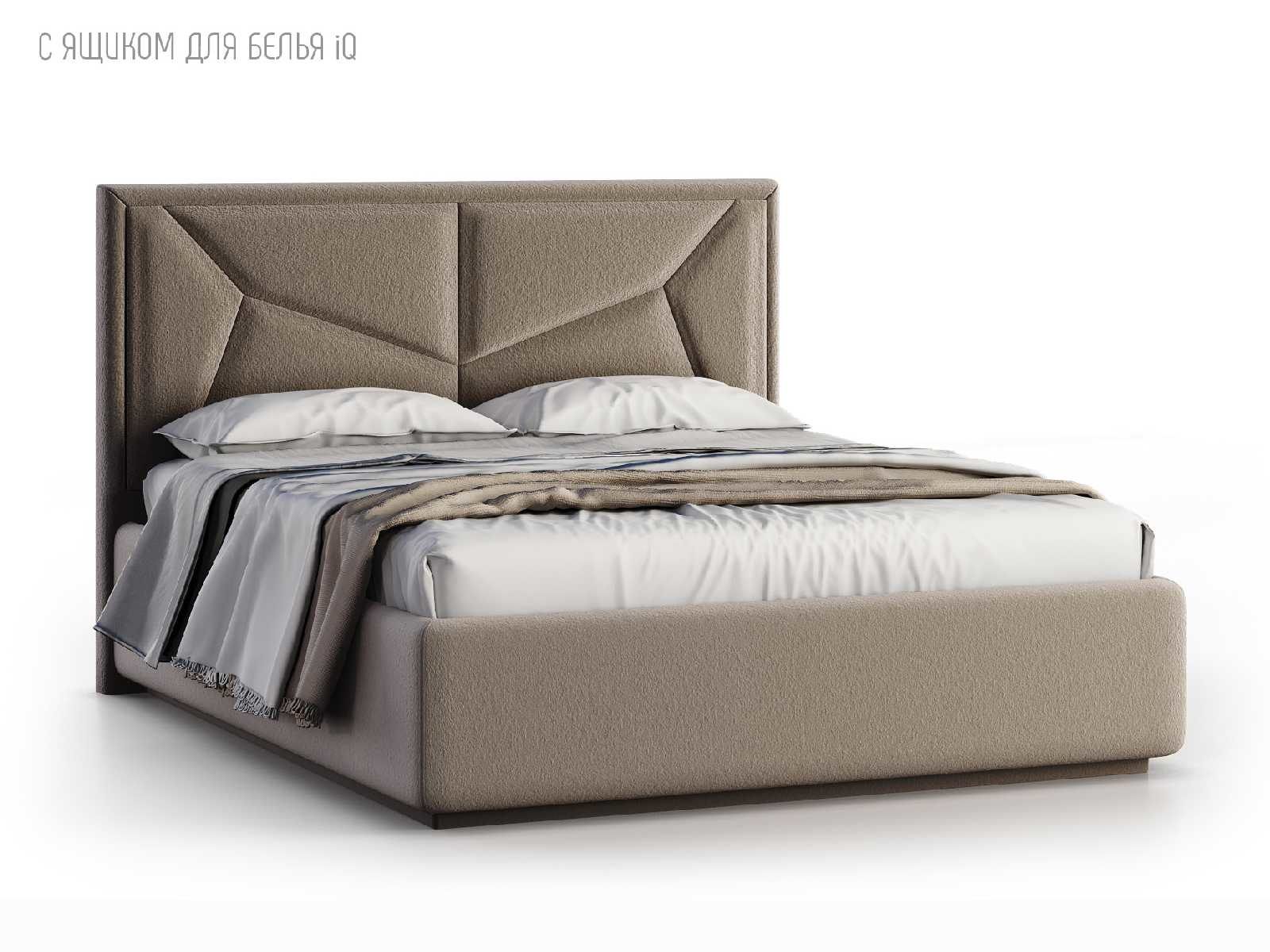 Кровать укомплектована IQ с подъемным механизмом и ящиком для белья без дна (дополнительная платная опция - дно к ящику IQ из HDF (ХДФ). Каркас кровати на цоколе, декоративный чехол на цоколе съёмный. Глубина ящика для белья - 30 см, без ограничения нагрузки на ящик.