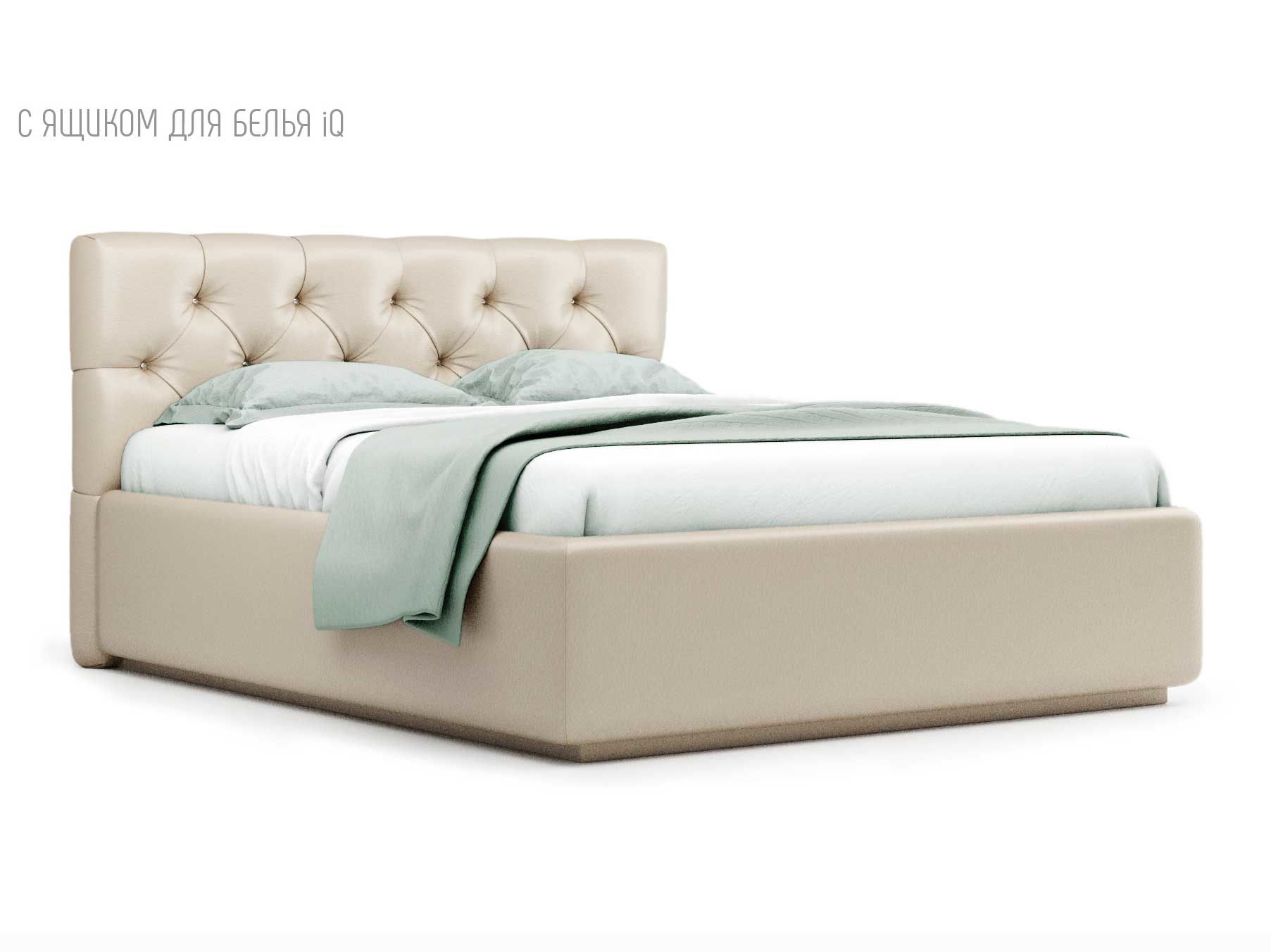 Кровать укомплектована IQ с подъемным механизмом и ящиком для белья без дна (дополнительная платная опция - дно к ящику IQ из HDF (ХДФ). Каркас кровати на цоколе, декоративный чехол на цоколе съёмный. Глубина ящика для белья - 30 см, без ограничения нагрузки на ящик.