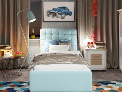 Односпальный вариант мягкой кровати Vita с высоким изголовьем для детей, подростков и взрослых. Изголовье имеет скругление на углах и декорировано стежкой с утяжками в виде небольших квадратов. Для придания особой изысканности и шарма изголовье можно декорировать пуговицами или стразами (платная опция).