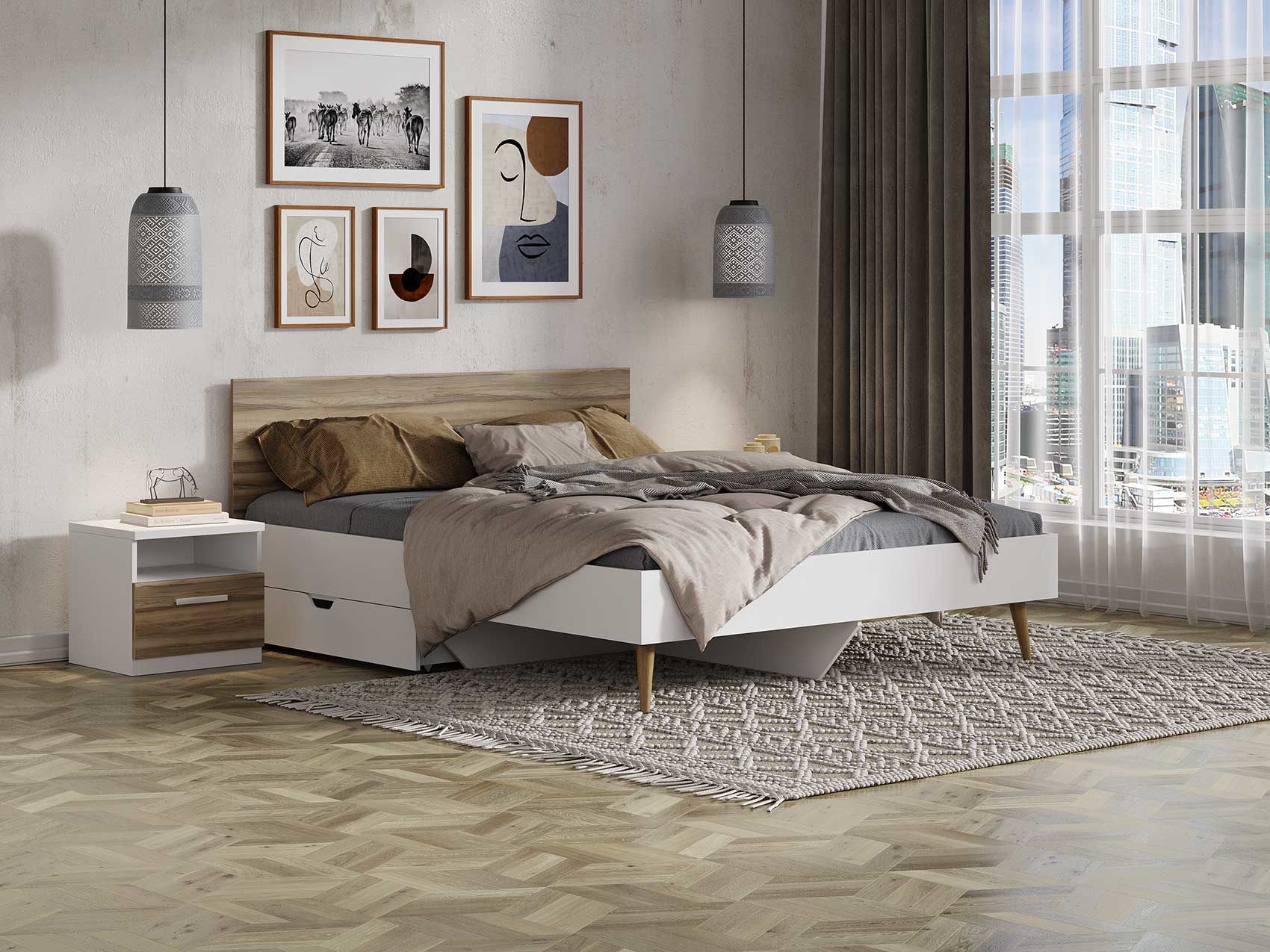 Кровать Ines оригинальное решение для спальни в скандинавском стиле. Благодаря деревянным ножкам кровать смотрится легкой и воздушной. В качестве основания используется настил из ЛДСП. Система усиленных средней и центральной царг позволяют выдерживать высокие нагрузки. Большое расстояние от пола до царги облегчает уборку под кроватью, делает доступной использование робота-пылесоса. Кровать можно укомплектовать ящиками для хранения вещей (приобретаются отдельно).