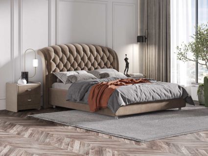 Стильная интерьерная кровать из экокожи с изогнутым изголовьем и широкими царгами. Модель изготовлена из ДСП.