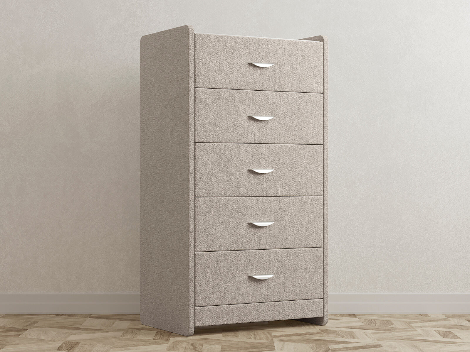 Комод с 5 ящиками сдержанного дизайна дополнит любой интерьер и сделает его более функциональным. Каркас комода и фасад ящиков покрыты обивочным материалом и выполняется в 43 вариантах цветового исполнения. Для удобства использования и продления срока эксплуатации, рекомендуется использовать стеклянную накладку. Накладка используется в качестве столешницы для тумбы и защищает ее от повреждений и загрязнений. Стеклянная столешница заказывается дополнительно.