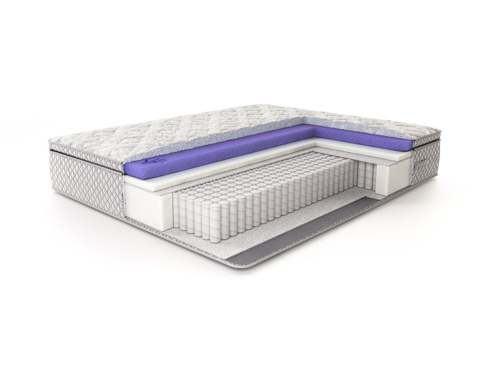 Роскошный рельефный чехол из жаккарда, простёганный по типу «слоёный пирог»: объёмное гипоаллергенное волокно холлкон 300 гр., ППУ 1 см, спанбонд — максимальный первоначальный комфорт. Чехол матраса несъемный.