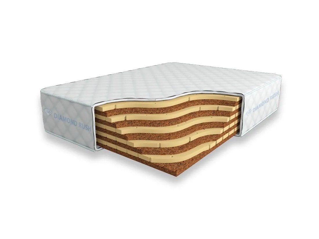 Матрас Diamond Rush SuperMix Cocos Contrast 30 DR является беспружинным, т.е. не имеет в своей основе пружинного блока. В его состав входит чередование слоев латексированной кокосовой койры и натурального латекса с перфорацией. Все слои по 3 см. Эта модель имеет разные по жесткости стороны.