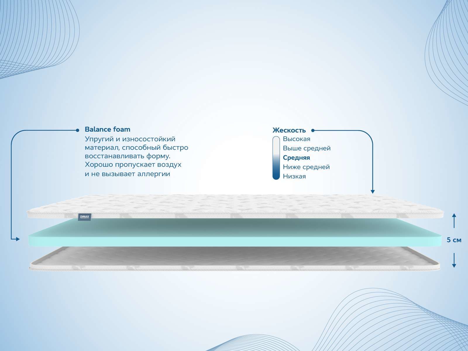Ортопедический наматрасник Димакс Balance Foam 5 см — топпер для мгновенного комфорта и коррекции неровных спальных поверхностей. Толстый слой ортопедической пены Balance Foam смягчает жёсткие матрасы, устраняет стыки и бугры и превращает даже раскладной диван в уютное спальное место.