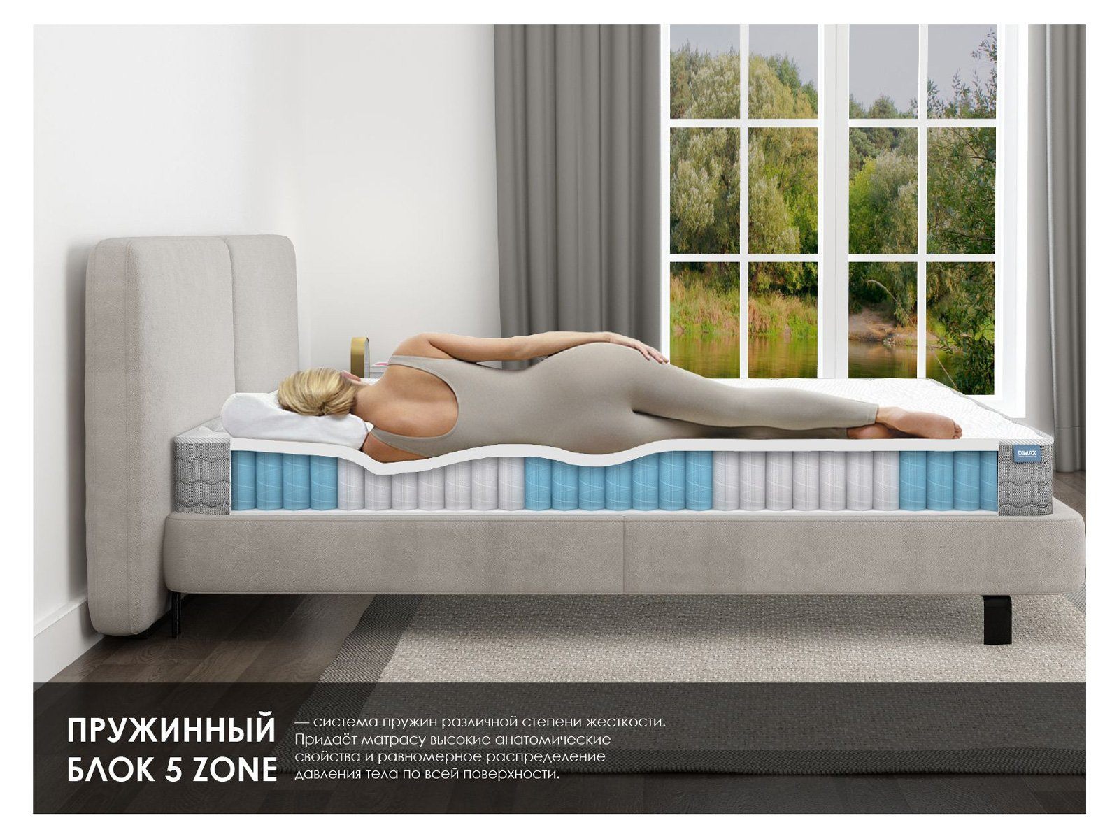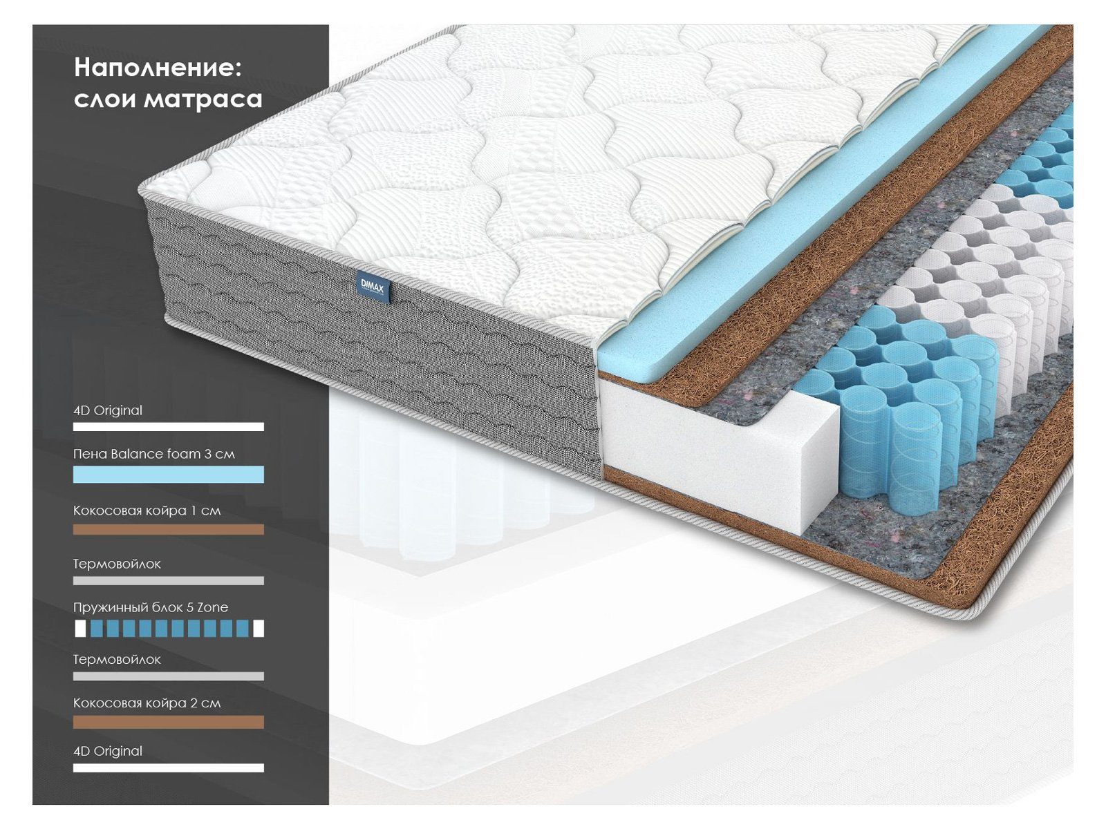 Матрас сочетает разное наполнение по сторонам, сохраняя единый уровень жёсткости, и использует зонированный пружинный блок для точечного распределения нагрузки.