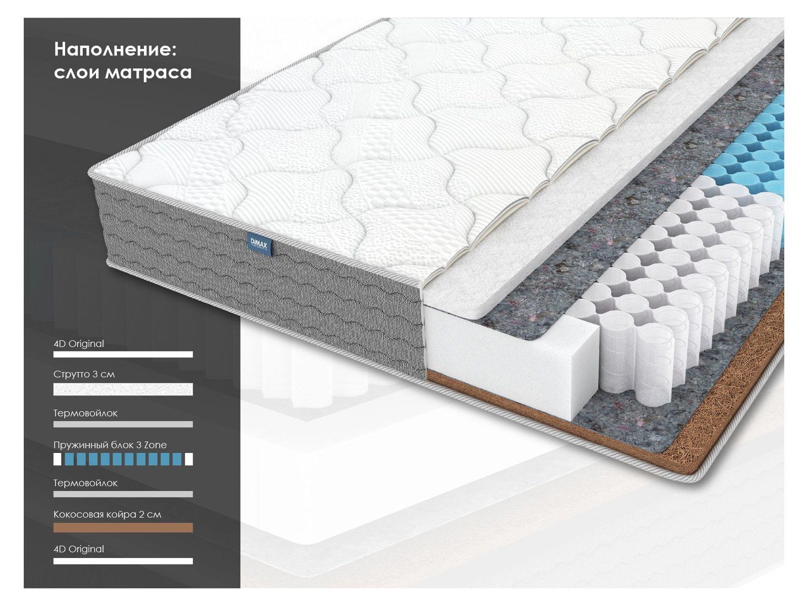 Димакс ОК Струтто Хард – это двусторонний ортопедический матрас в скандинавском стиле с разными по мягкости и комфорту поверхностями. Модель построена на инновационном блоке с тремя зонами жёсткости с учётом усиленной поддержки позвоночника и бёдер.