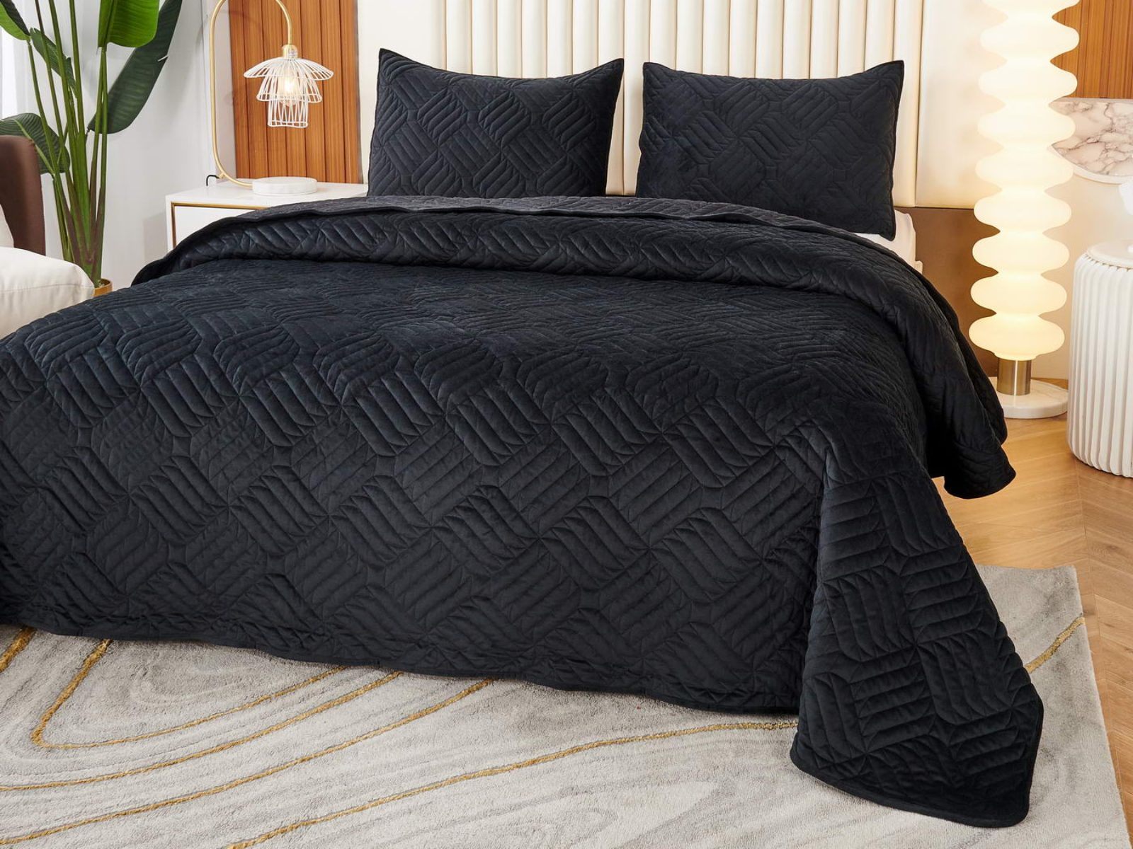 Покрывала выполнены в 10 оттенках: крем, мокко, пепельный, песочный, светло-бежевый, светло-серый, серый, темно-серый, чайная роза и черный. Стежка в виде геометрического орнамента подойдет к любому современному интерьеру. Из-за особого плетения, велюровая ткань покрывала отражает свет и красиво переливается при различном освещении.